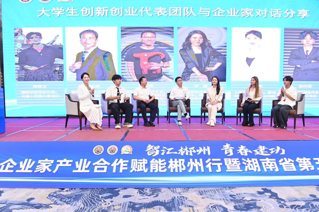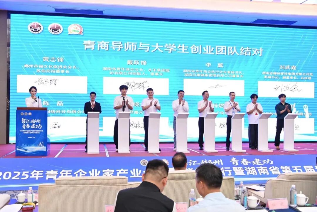 02 助力大学生创新创业暨2025年青商“大家谈”——智创未来:青年企业家在AI时代下的机遇 郴州市政协党组书记、主席陈跃文致辞。 在助力大学生创新创业暨2025年青商“大家谈”环节,湖南省青年商会会长、水羊集团股份有限公司董事长戴跃锋,湖南省青年商会执行会长、秘书长,湖南百康健康管理有限公司董事长李翼,苏仙宾馆董事长黄志峰三位成熟企业家代表围绕“智创未来:青年企业家在AI时代的新机遇”主题,与湘南学院创业代表、郴州长卷“喝个锤子”饮品店主理人薛梓煜,伟业板材总经理、郴州市青商会副会长王艳,湘南学院创业代表、非遗露营云栖小野餐酒吧负责人樊晓龙三位大学生创新创业代表进行了对话交流,充分发挥成功企业家的经验和资源优势,为青年创业者搭建施展才华、建功立业的广阔平台。 通过深度对话,青商导师与大学生创业团队进行了结队帮扶签约,助力大学生创新创业项目落地与发展,激发合作新潜能,绘就大学生“背着双肩包、创业到郴州”的美好图景。